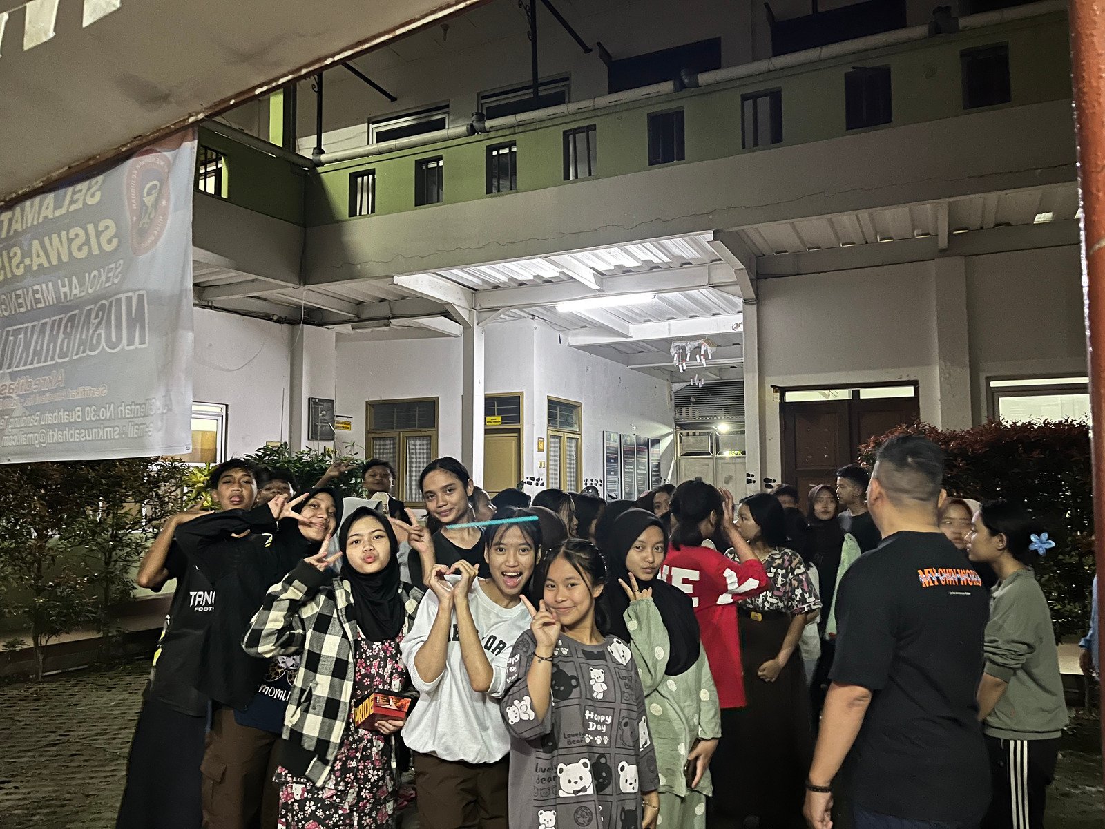 Menjelang malam, suasana semakin hangat dengan kegiatan api unggun dan nonton bareng (nobar) di lapangan sekolah. Momen ini menjadi ajang kebersamaan antara peserta dan panitia, sekaligus mempererat rasa solidaritas antar siswa. Hari pertama ditutup dengan persiapan tidur bersama di aula sekolah.